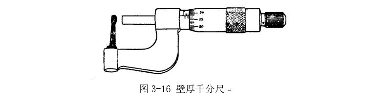 壁厚千分尺如圖3-16所示。主要用于測量精密管形零件的壁厚。壁厚千分尺的測量面鑲有硬質合金,以提高使用壽命。