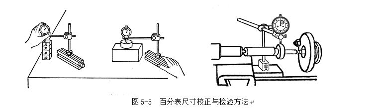 3 用百分表校正或測量零件時,如圖5-5所示。應當使測量桿有一定的初始測力。即在測量頭與零件表面接觸時,測量桿應有0.3~1mm的壓縮量(千分表可小一點,有0.1mm即可),使指針轉過半圈左右,然后轉動表圈,使表盤的零位刻線對準指針。輕輕地拉動手提測量桿的圓頭,拉起和放松幾次,檢查指針所指的零位有無改變。當指針的零位穩定后,再開始測量或校正零件的工作。如果是校正零件,此時開始改變零件的相對位置,讀出指針的偏擺值,就是零件安裝的偏差數值。