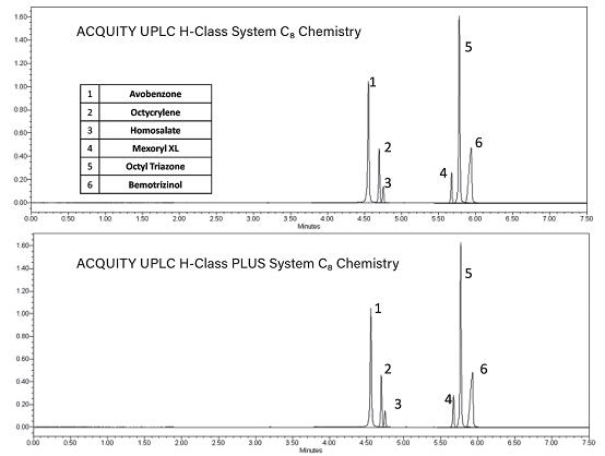圖1. 分別在ACQUITY UPLC H-Class和ACQUITY UPLC H-Class PLUS系統上使用ACQUITY UPLC BEH C8色譜柱填料分離各種防曬霜活性成分標準品得到的疊加色譜圖。