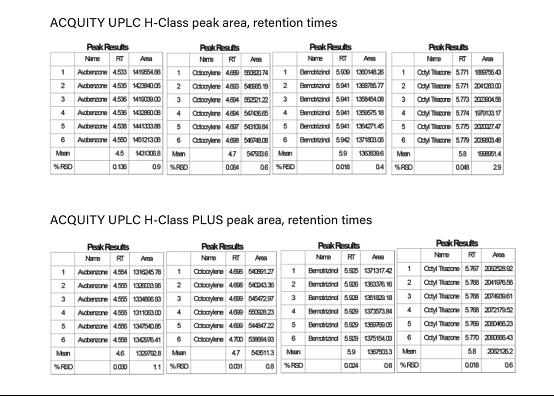圖3. ACQUITY UPLC H-Class和ACQUITY UPLC H-Class PLUS系統的代表性保留時間和峰面積數據。