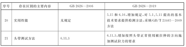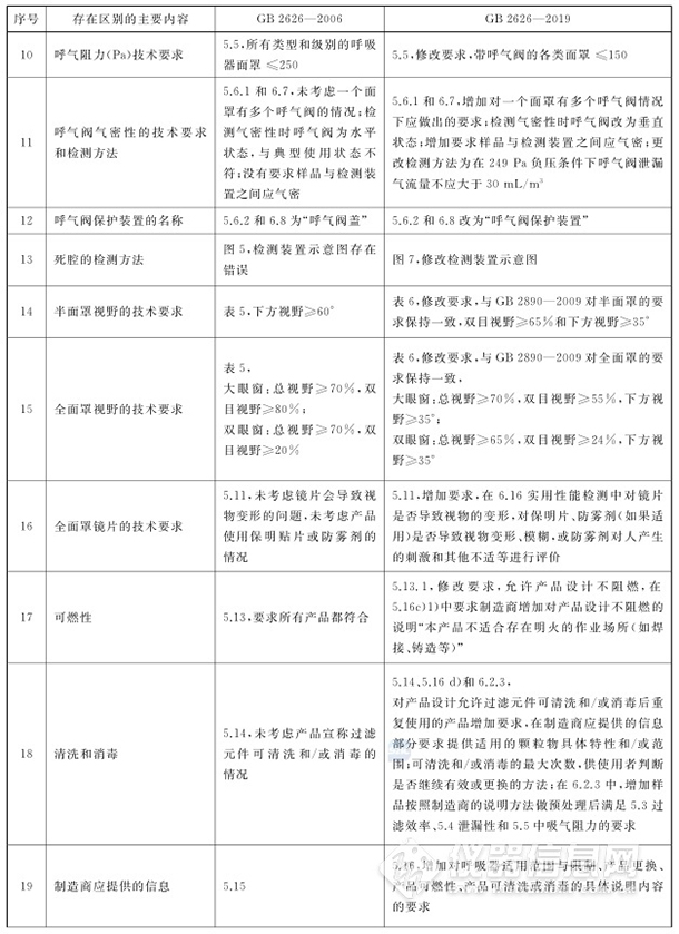 新標準在顆粒物過濾效率檢測方法(檢測設備分辨率、顆粒物粒徑的換算方法、KP過濾元件過濾效率加載測試終點判斷方法)、泄露性的檢測方法、呼吸阻力的檢測方法、呼吸阻力的技術要求、呼氣閥氣密性的技術要求和檢測方法、呼氣閥保護裝置的名稱、死腔的檢測方法、半面罩視野的技術要求、全面罩視野的技術要求、全面罩鏡片的技術要求、可燃性、清洗和消毒、制造商應提供的信息、使用性能、頭帶測試方法等方面的要求都進一步細化。