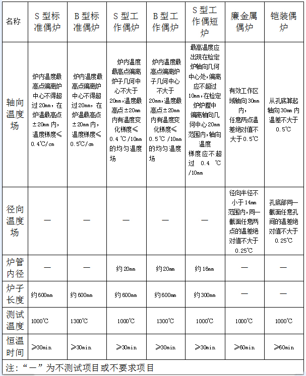 檢定爐的技術要求如下表: