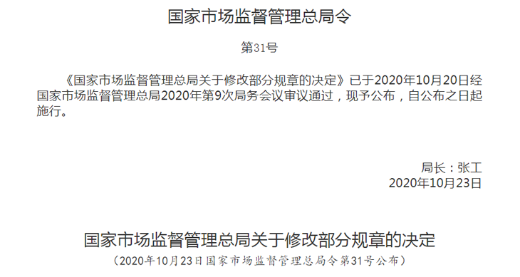 為了全面落實黨的十九屆三中全會審議通過的《中共中央關于深化黨和國家機構改革的決定》《深化黨和國家機構改革方案》和十三屆全國人大一次會議批準的《國務院機構改革方案》,確保行政機關依法履行職責,進一步推進簡政放權、放管結合、優化服務改革,市場監管總局決定對30件部門規章的部分條款予以修改。
