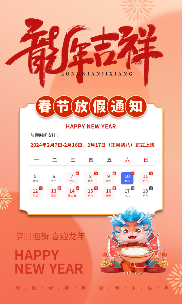 龍年新春佳節來臨之際,根據國家有關規定,現將2024年春節放假事項通知如下: