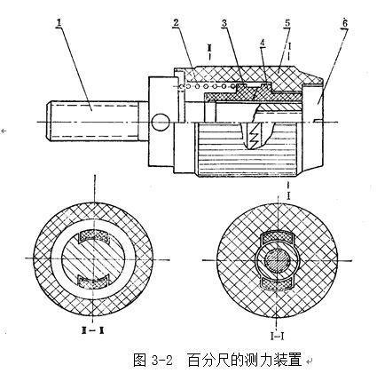 百分尺測力裝置的結構見圖3-2,主要依靠一對棘輪3和4的作用。棘輪4與轉帽5連結成一體,而棘輪3可壓縮彈簧2在輪軸1的軸線方向移動,但不能轉動。彈簧2的彈力是控制測量壓力的,螺釘6使彈簧壓縮到百分尺所規定的測量壓力。當我們手握轉帽5順時針旋轉測力裝置時,若測量壓力小于彈簧2的彈力,轉帽的運動就通過棘輪傳給輪軸1(帶動測微螺桿旋轉),使百分尺兩測量面之間的距離繼續縮短,即繼續卡緊零件;當測量壓力達到或略微超過彈簧的彈力時,棘輪3與4在其嚙合斜面的作用下,壓縮彈簧2,使棘輪4沿著棘輪3的嚙合斜面滑動,轉帽的轉動就不能帶動測微螺桿旋轉,同時發出嘎嘎的棘輪跳動聲,表示巳達到了額定測量壓力,從而達到控制測量壓力的目的。當轉帽逆時針旋轉時,棘輪4是用垂直面帶動棘輪3,不會產生壓縮彈簧的壓力,始終能帶動測微螺桿退出被測零件。