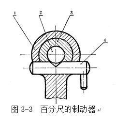 百分尺的制動器,就是測微螺桿的鎖緊裝置,其結構如圖3-3所示。制動軸4的圓周上,有一個開著深淺不均的偏心缺口,對著測微螺桿2。當制動軸以缺口的較深部分對著測量桿時,測量桿2就能在軸套3內自由活動,當制動軸轉過一個角度,以缺口的較淺部分對著測量桿時,測量桿就被制動軸壓緊在軸套內不能運動,達到制動的目的。